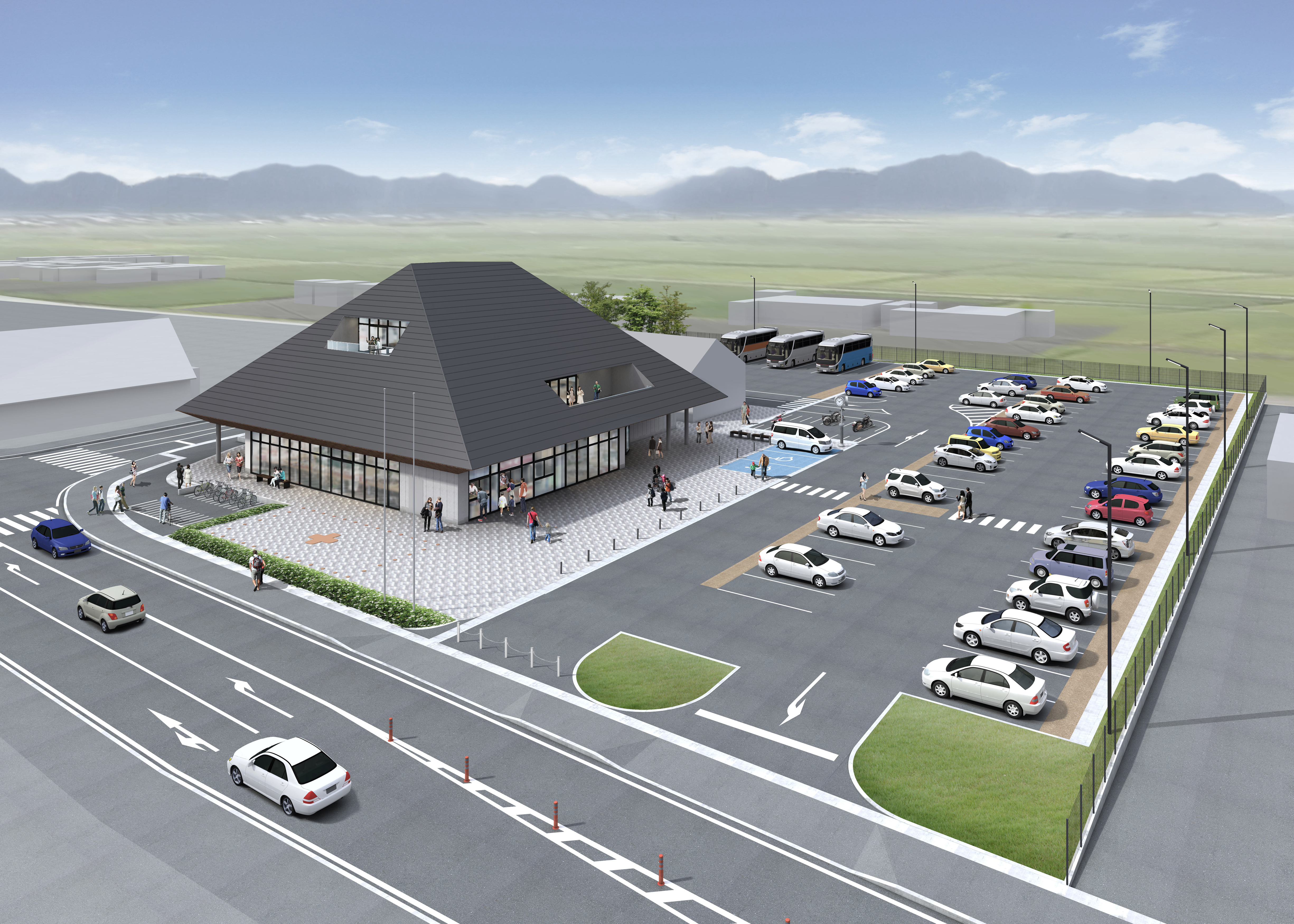 | 観光産業の推進 | <唐古・鍵遺跡史跡公園> 日本を代表する史跡である「唐古・鍵遺跡」。この地から弥生時代の遺構や遺物が数多く発見され、弥生人の生活が明らかにされてきました。 国史跡という特色を生かし、史跡公園として活用を図るため、周囲の田園風景を含めた弥生時代の「風景」の再現と、かつてこの場で行なわれていたであろう「生活」を追体験できる場をコンセプトに、道の駅や唐古・鍵考古学ミュージアムと連携し、本町における体験型教育の場、観光拠点を創出します。 <道の駅「レスティ唐古・鍵」> 唐古・鍵遺跡史跡公園と隣接し、さまざまな観光サービスを提供する交流施設「道の駅」が誕生します。 大きな寄棟屋根の「道の駅」と史跡公園の「楼閣」という対峙する2つの建物が、このエリアのシンボルとして特徴的な建物風景を生み出します。 館内では地元の新鮮な野菜、特産品の販売や飲食店を展開。 若い女性も訪れやすい美しく、清潔でおしゃれな空間を演出します。地元客で日常的に賑わい、観光客は非日常感が楽しめる交流施設を目指します。 |