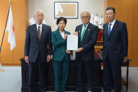 令和7年12月10日、全国町村議会議長会の中本正廣会長(広島県安芸太田町議会議長)をはじめとする地方議会三団体の会長は、「学習指導要領に「学校と議会が連携した主権者教育の推進」について明記を求める決議」の実現に向けて、福田かおる文部科学大臣政務官に要請しました。